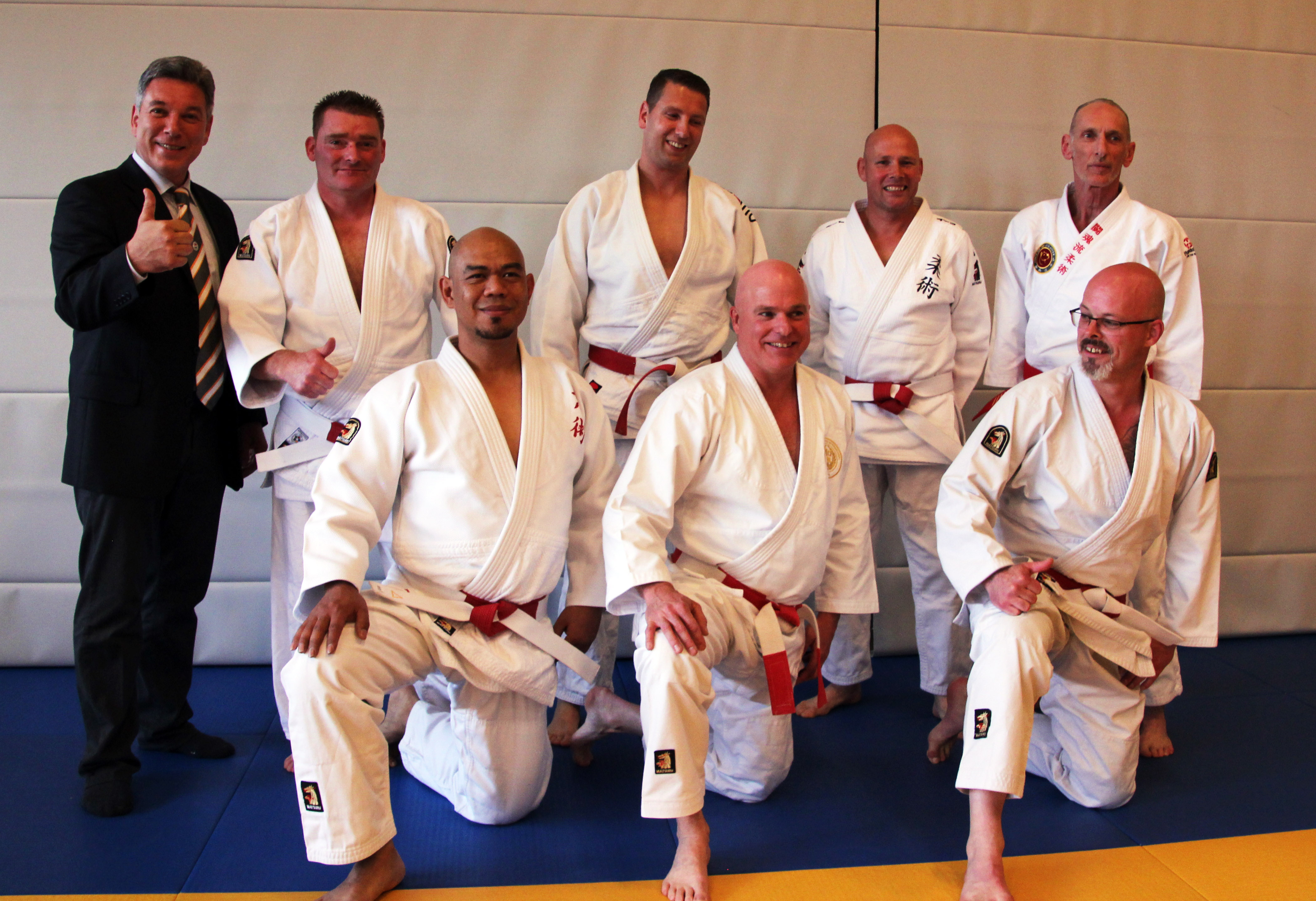 Eind mei werd het gerucht bevestigd dat er 4 jiu-jitsuka’s (allemaal uit ons district), als onderdeel van een pilot, waren gevraagd om voor het eerst een technisch examen af te leggen voor 6e dan jiu-jitsu. Deze heren, Andy Jong Tjien Fa, Ruud van Roosmalen, Marcel Lucassen en Guus de Laure, bleken na afloop allemaal geslaagd te zijn voor dit zware technische examen. Ook deze heren kregen de uitnodiging om aanwezig te zijn in Wijk bij Duurstede.